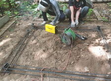 Первым этапом работ будет создание добротного фундамента. Для этого мы вкручиваем четыре металлические сваи, к которым привариваем арматурный каркас.